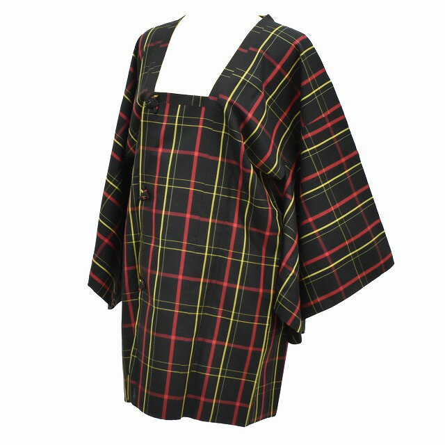【中古】 リサイクル コート 塵除け 正絹 道行衿 はおり 身丈67cm Lサイズ 裄84cm Mサイズ 大島紬 黄八丈 格子文様 黒系 mm0395b 【着物ひととき】